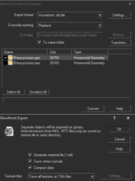 From here, select the model format desired (in this case, OBJ). If this is your first time using the program, be sure to select the "Options" button next to the model format and specify options "Generate material file (*.mtl)", and texture format TGA.