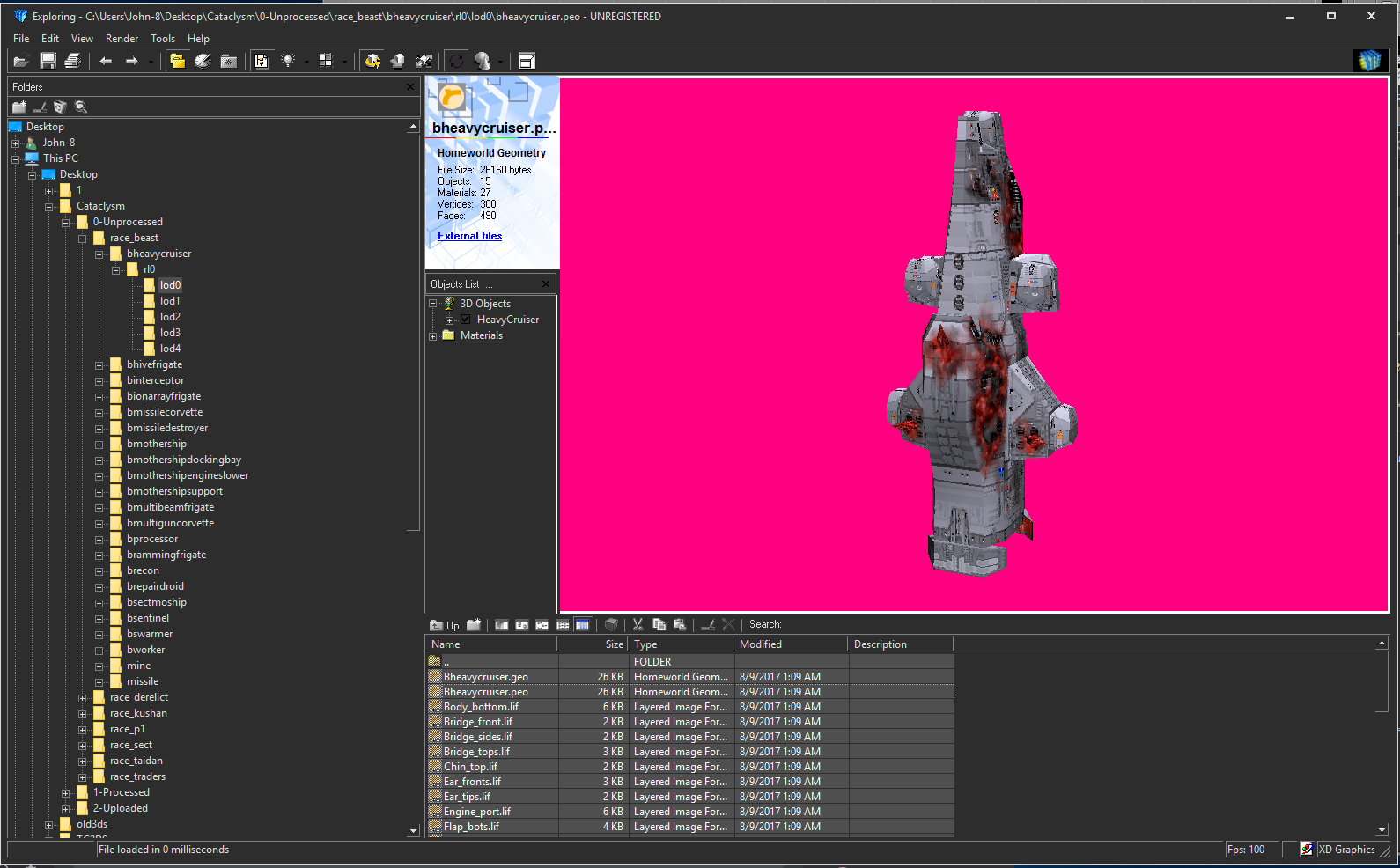 Once the .BIG file is extracted, you will be left with many folders containing various files. Most ships are stored in folders prefixed with "race_". .GEO, .MEX, and .PEO files are related to the geometry and 3D models. .LIF files contain the textures used by the ships.